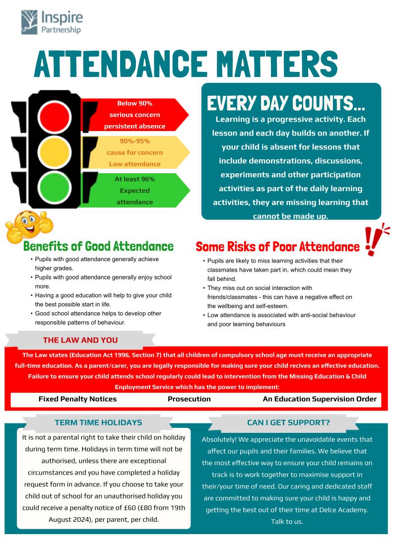 At Delce Academy, excellent attendance is everyone’s responsibility. We know that regular, punctual attendance lays the foundation for strong academic outcomes, confident learners, and positive wellbeing. Every day in school matters. Each lesson builds on the last, and children who attend consistently are more likely to thrive—socially, emotionally, and academically.